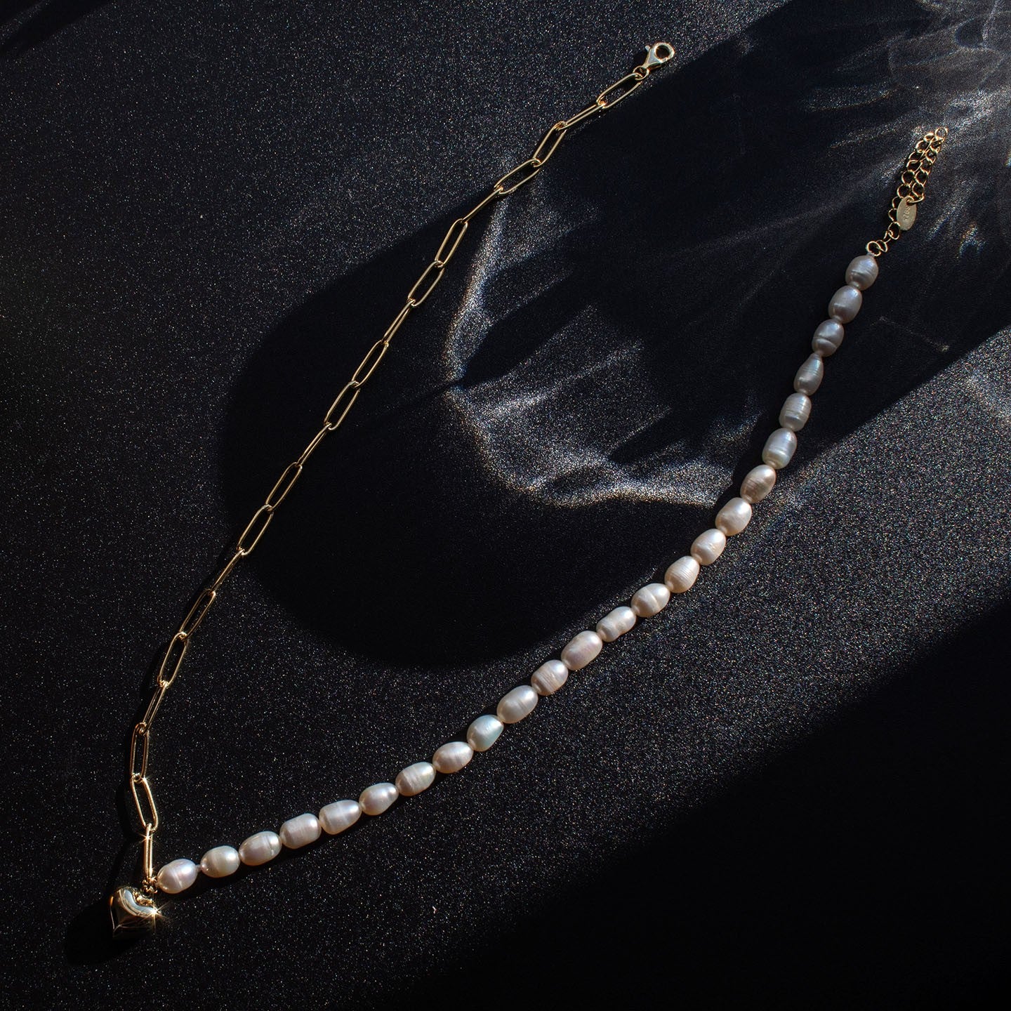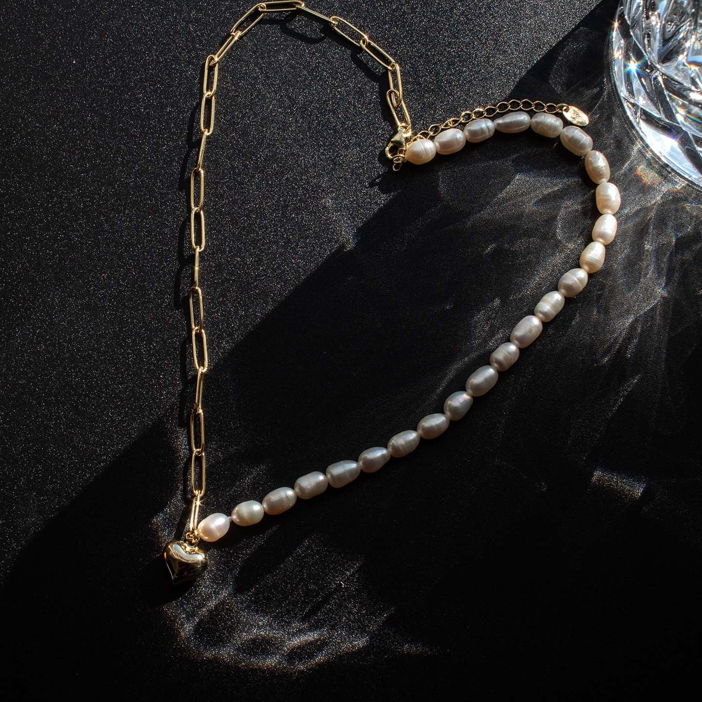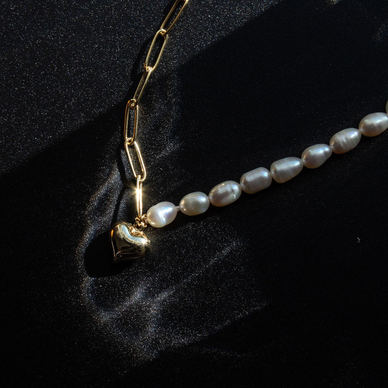 Diese Kette verbindet goldene Eleganz mit der sanften Anmut von Süßwasserperlen, gekrönt von einem zarten Herzanhänger. Ein Symbol für Liebe, Neuanfang und Schönheit, das an die leuchtende Kraft der Morgensonne erinnert.